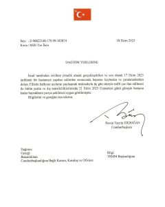 Cumhurbaşkanı Recep Tayyip Erdoğan, Filistin’de çoğu çocuk ve masum sivillerden oluşan binlerce şehide duyulan saygının bir gereği olarak Türkiye’de 3 günlük milli yas ilan edildiğini bildirdi.