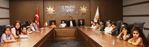 AK Parti Mardin İl Başkanlığı’nda 23 Nisan dolayısıyla il başkan yardımcıları koltuklarına oturan çocuklardan Filistin’de artık çocuklar ölmesin, barış gelsin mesajları çıktı.